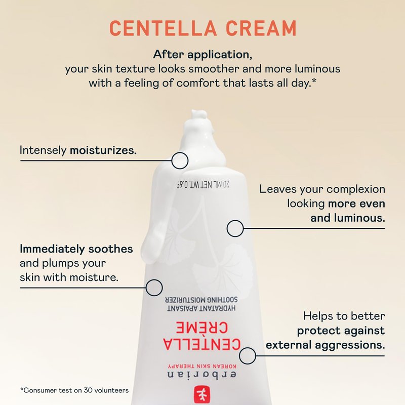 - Erborian Centella Cream: Centella Cream gives your skin a daily dose of hydration combined with soothing action. With its light texture, Centella Cream intensely moisturizes without feeling heavy on the skin, providing a feeling of comfort that lasts all day!* 20 mL. *Consumer test on 30 volunteers
