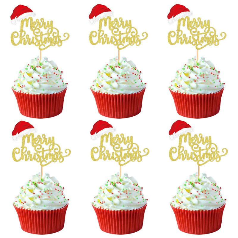 Ercadio 24 Pack Merry Christmas Cupcake Toppers Gold Glitter Santa Hat Christmas Cupcake Picks Merry Xmas Cupcake Decoration Winter Christmas Theme Xmas Holiday Birthday Party Supplies