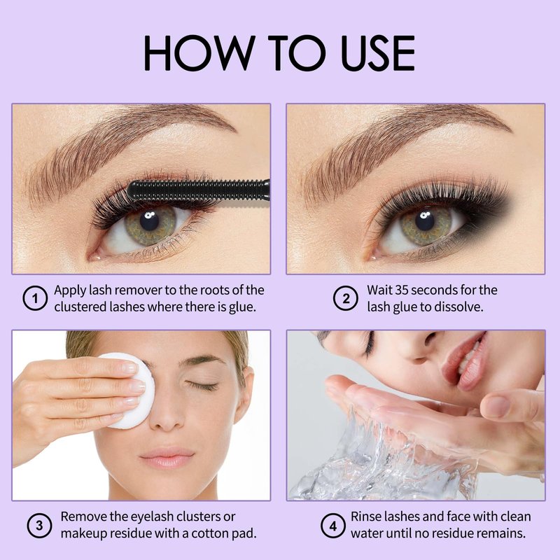 - 【HOW TO USE】1. Brush the lashes from the root to the tip evenly, and apply more on the root when removing cluster lashes. 2. Gently brush lashes after waiting for 30-60 seconds, the mascara or cluster lashes can easily fall off. 3. To protect the thin and sensitive skin, use a cotton pad to gently wipe away residues instead of hard rubbing.