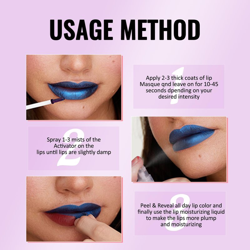 - 【EASY TO USE】After cleaning your lips and applying lip care products, you can apply a layer of peel-off lip gloss and wait for it to dry and form a film. You can put a tissue under your lips, spray the activator on your lips once or twice, then peel off or wipe off the film with a tissue to reveal the lip color, and finally apply a moisturizing lip oil.