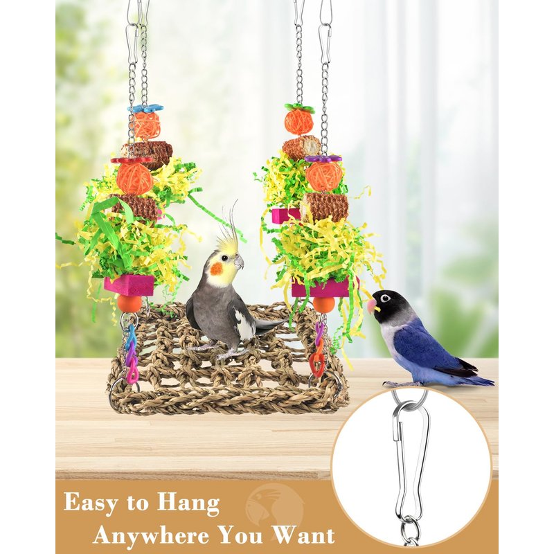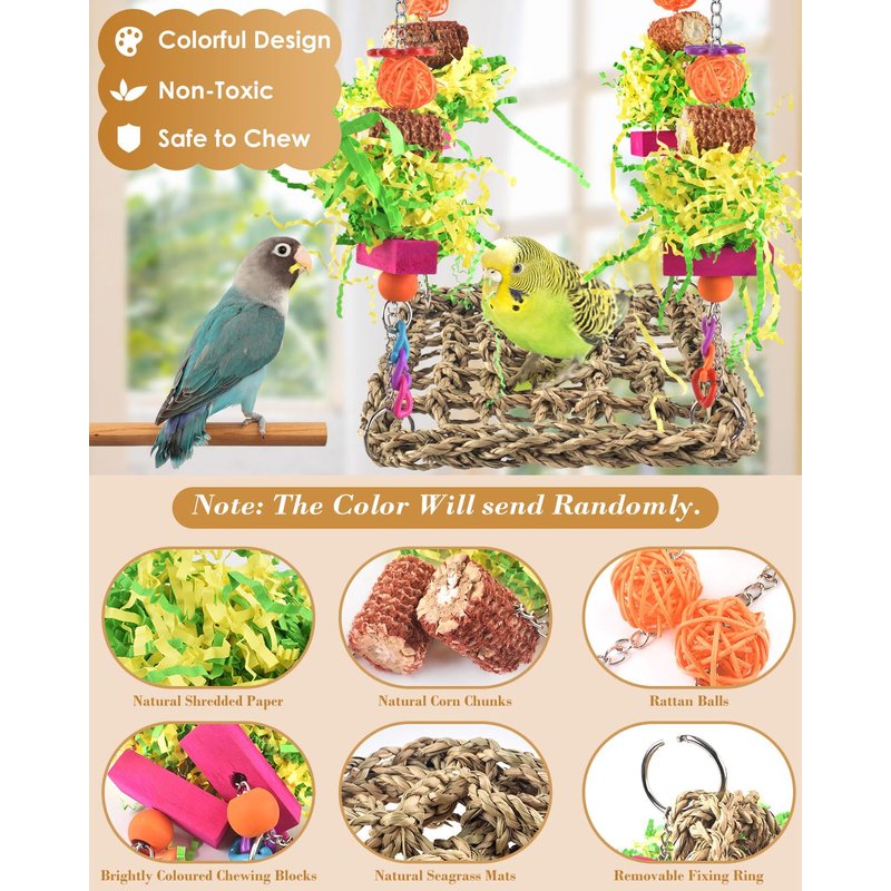 - Happy time :Our bird seagrass foraging wall will give your bird friends a happy playtime. When you sent this lovely bird toys for parakeets to your friends' house,your bird friends will crazy for it,biting off papers for great fun,swinging and climbing on seagrass net,chewing this or that happily.