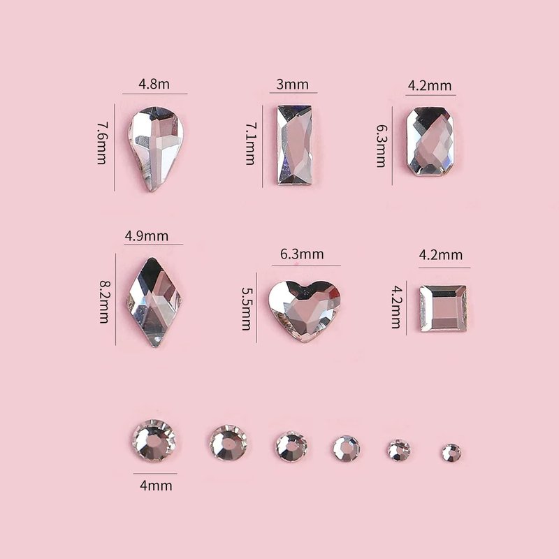 Description: Product Name:Multi Shapes Crystal Nail Gemstone Brand:Eseres Material:K9 Glass Color:Transparent Size:Mixed Size Package Contents: 1 case of silver nail rhinestones Notes: Due to the light and screen setting difference, the item's color may be slightly different from the pictures. Please allow slight dimension difference due to the manual measurement.