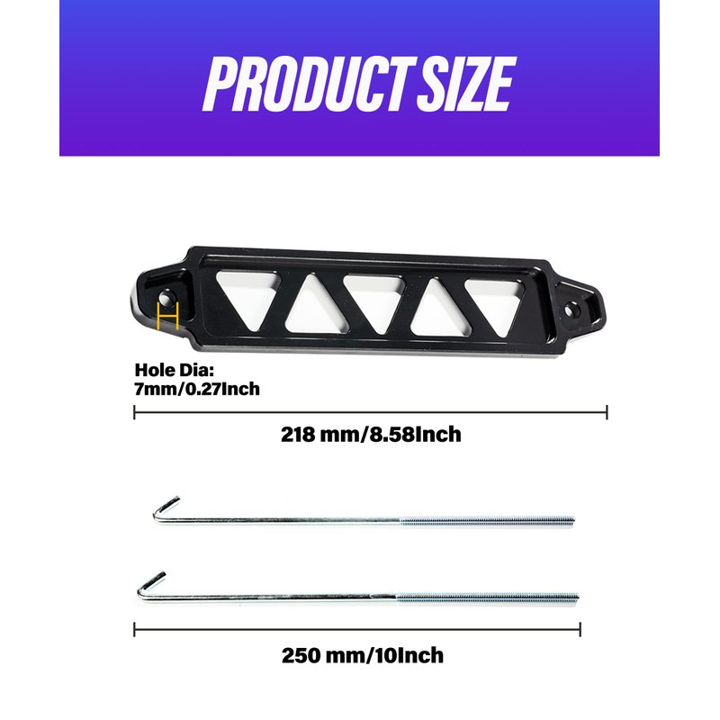 - [Product Size] The total length of our battery mounting bracket is 8.58 ", the distance between bolt centers is 7.48", and the bolt length is 10 ". For excessively long bolts, the hook can be appropriately cut.