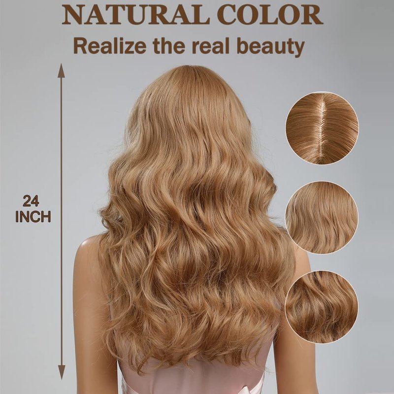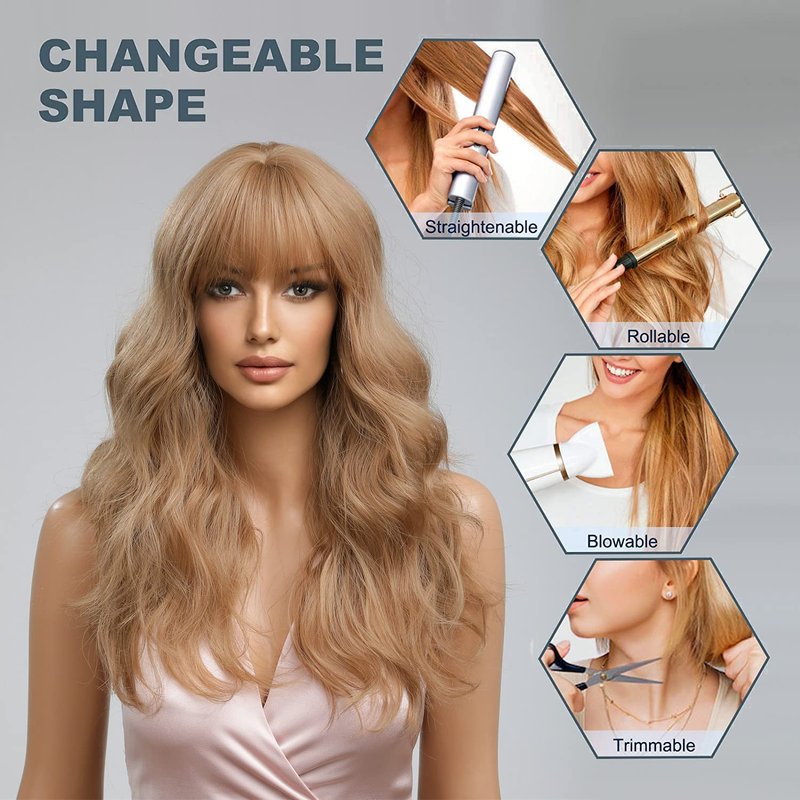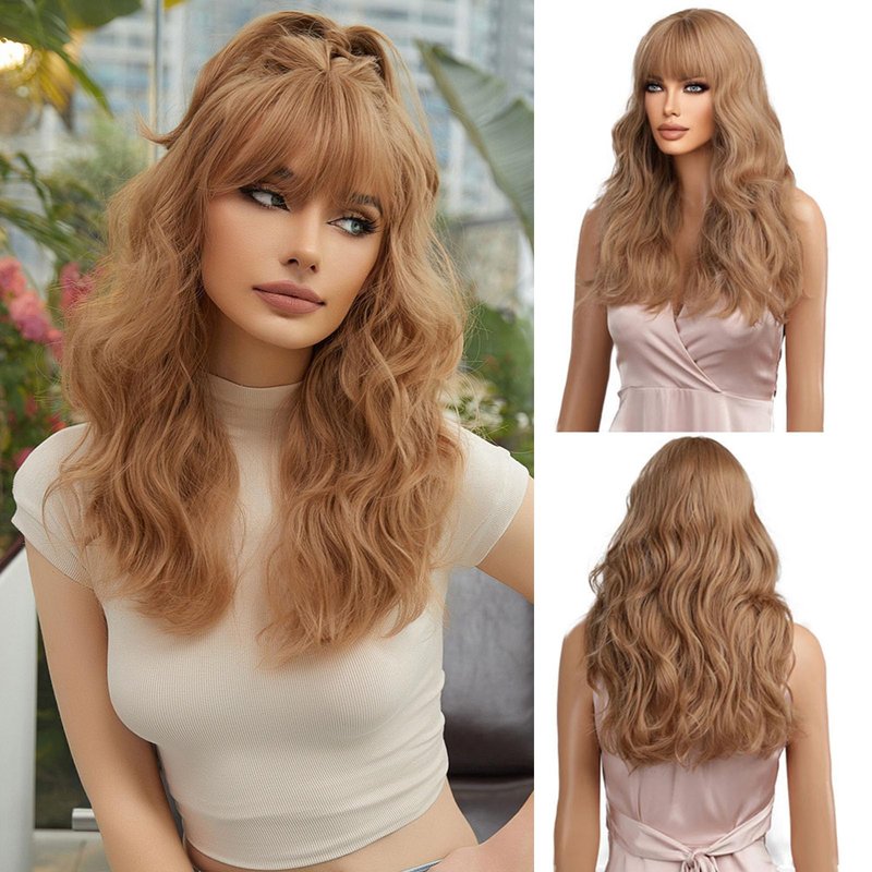 Esmee Strawberry Blonde Long Wavy Wig with Bangs for Women Natural Synthetic Hair Heat Resistant Wigs for Daily Party Cosplay Wear 22 Inches