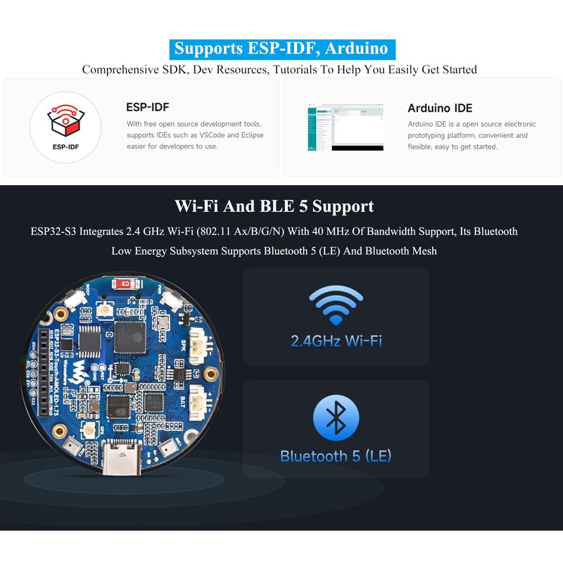 - Powerful Processor: Equipped with ESP32-S3R8 Xtensa 32-bit LX7 dual-core processor, up to 240MHz main frequency. Supports 2.4GHz W-F--i (802.11 b/g/n) and BLE 5 (LE), with onboard antenna. Built in 512KB of SRAM and 384KB ROM, with onboard 8MB PSRAM and an external 16MB Flash memory.
