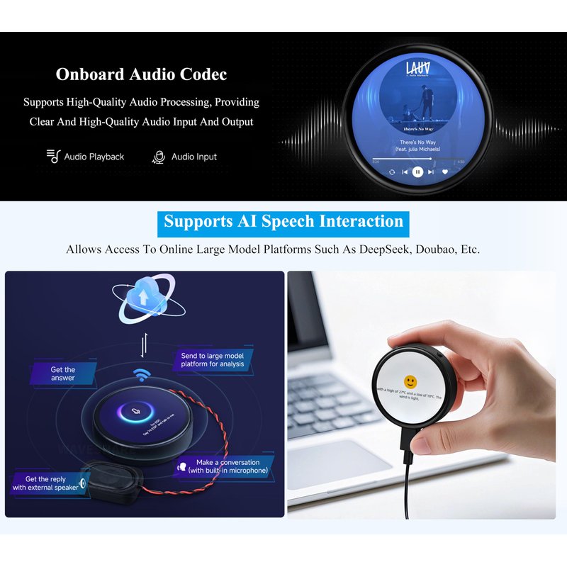- Supports AI Speech Interaction: Onboard audio codec, supports high-quality audio processing, providing clear and high-quality audio input and output. Allows access to online large model platforms such as DeepSeek, ChatGPT, Doubao, etc.