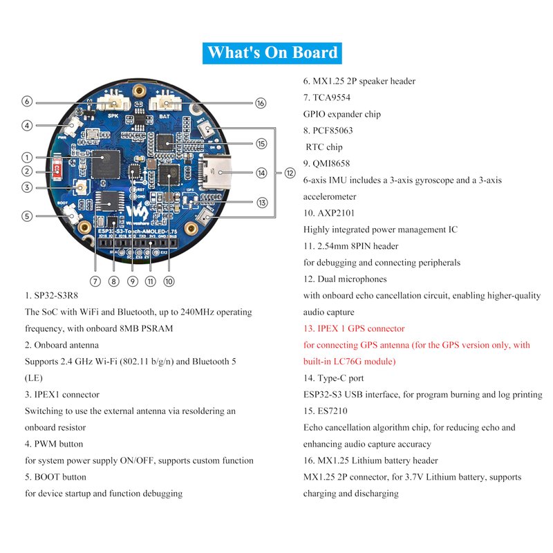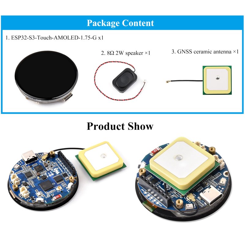 ESP32-S3 with 1.75inch AMOLED Round Touch Display Development Board, 466x466, QSPI Interface,Onboard Dual Digital Microphone Array, Support AI Speech Interaction, with 8Ω 2W Speaker and GPS Antenna