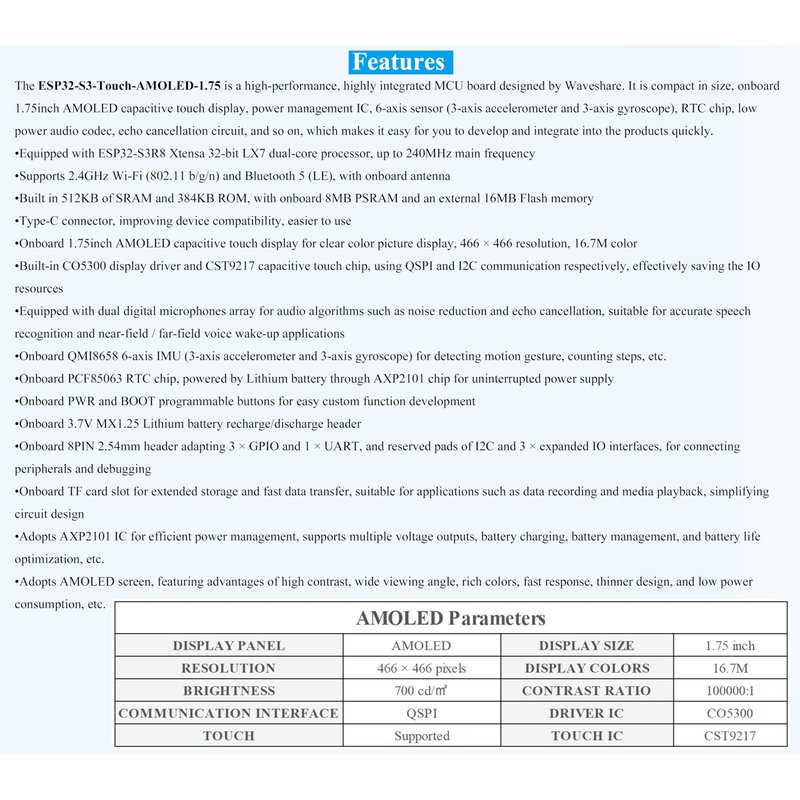 - Driver and Touch Chip & Sensor : Built-in CO5300 display driver (QSPI Interface) and CST9217 capacitive touch chip ( I2C Interface), using QSPI and I2C communication respectively, effectively saving the IO resources. Onboard QMI8658 6-axis IMU (3-axis accelerometer and 3-axis gyroscope) for detecting motion gesture, counting steps, etc.