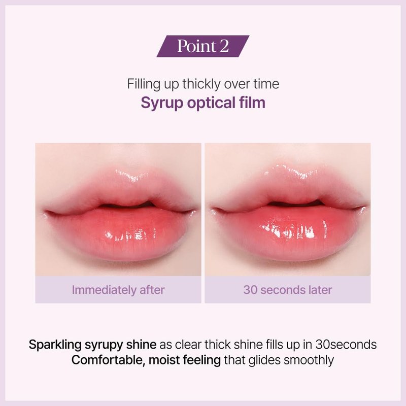- THICKENING SYRUP RADIANCE OVER TIME : As time passes, a thickening syrup-like radiance emerges. Wait just 30 seconds, and a clear and lush gloss will gradually rise, completing a sparkling syrup shine!