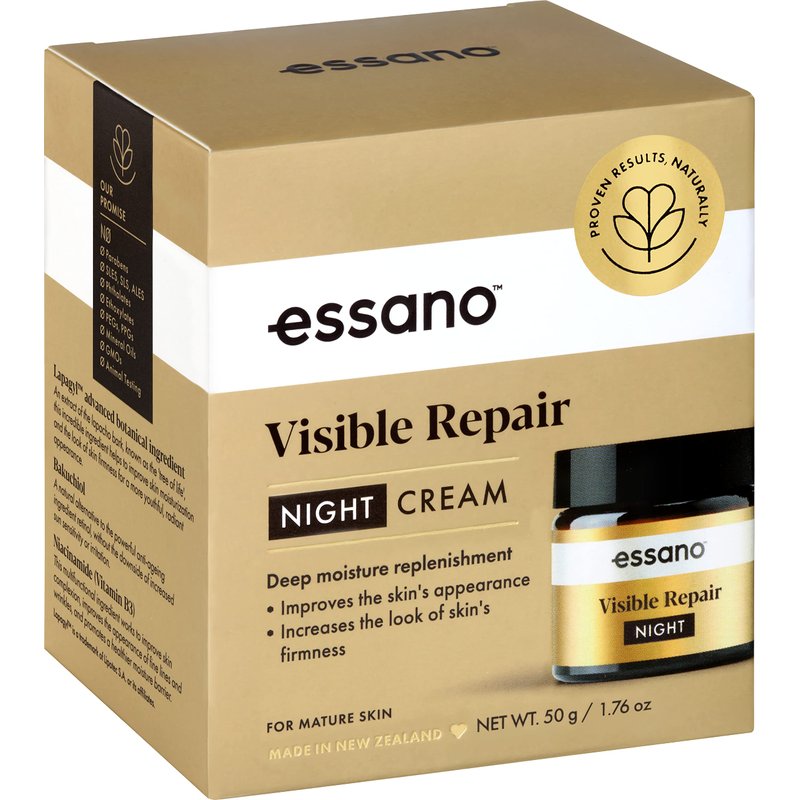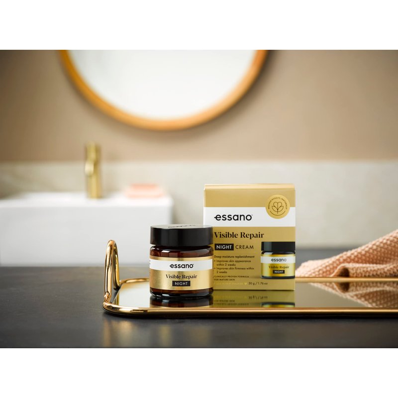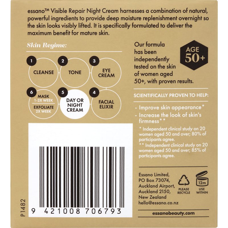 essano Visible Repair Night Cream harnesses a combination of natural, powerful ingredients to provide deep moisture replenishment overnight so skin looks visibly lifted. It is specifically formulated to deliver the maximum benefit for mature skin. Our formula has been independently tested on the skin of women aged 50+, with proven results.