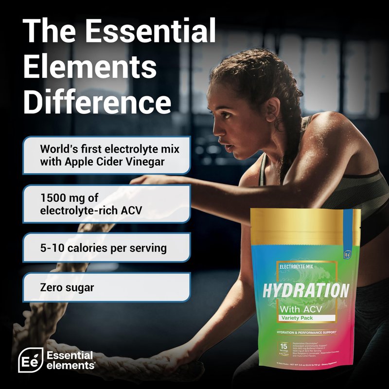 Essential Elements Hydration Packets - Variety Pack - Sugar Free Electrolytes Powder Packets - 15 Stick Packs of Electrolytes Powder No Sugar - Hydration Drink - with ACV & Vitamin C