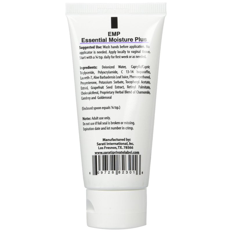 Sarati EMP Essential Moisture Plus Natural Vaginal Moisturizer Cream is an effective white cream with natural plant-derived herbs to help with vaginal dryness. It comes in a 2 ounce tube. This product is designed for relief from symptoms of vaginal irritation, problems with urination, vaginal dryness and itching, and painful intercourse. The advantage of Sarati’s EMP Vaginal Moisturizer Cream as a vaginal dryness treatment is its all natural formula which encourages your body to produce its own natural moisture to fight vaginal dryness. Most other products act as lubricants only. Suggested Use: Wash hands before application. No applicator is needed. Apply locally to the vulva area and vaginal tissues. Start with a l/4 tsp. daily for first week and then use as needed.