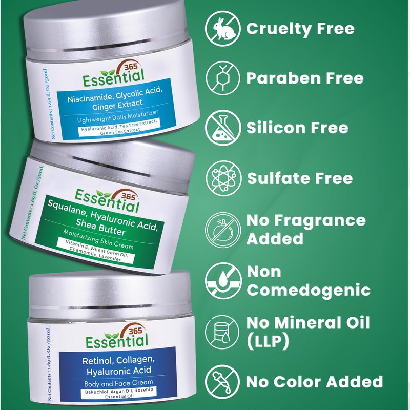 Essential365 Squalene, Hyaluronic Acid Cream is a versatile and effective skincare solution, perfect as a skin hydration for all skin types. This Hyaluronic acid cream, Enriched With Argan Oil, Shea Butter, Jojoba, Grape Seed, Wheat Germ, Chamomile,Lavender, goes beyond being a simple hydrating cream for women & men; it is a comprehensive hydrating face cream for women and men alike. This skin moisturizer cream is crafted in a 1.69 Fl Oz (50ml) cream form. This hydrating night cream for face is designed to hydrate, making it an ideal hydrating moisturizer face cream. The inclusion of key active ingredients like Squalene and Hyaluronic Acid contributes to a wrinkle-lifting effect, making it one of the best women & mens face glow cream available. Essential365 is committed to clean skincare, being sulfate-free, paraben-free, and made from 92% organic ingredients. It stands out as the best cream with added benefits of being a face cream for women and a hydrating cream for face. This wrinkle free face cream is more than just a wrinkle lifting face cream; it is a hydrating facial moisturizer that nourishes the skin. Whether used as a daily hydrating cream or as a part of your nighttime skincare routine, Essential365 caters to all skincare needs. For men, this cream serves as a reliable mens best hydrating face moisturizer face cream, providing a non-greasy feel and quick absorption into the skin that delivers on both efficacy and quality. Experience the transformation with Essential365 Squalene, Hyaluronic Acid, Hyaluronic Acid Cream – a face cream that doubles as a hydrating moisturizer, ensuring your skincare routine is a blend of hydrating, and wrinkle-lifting benefits.