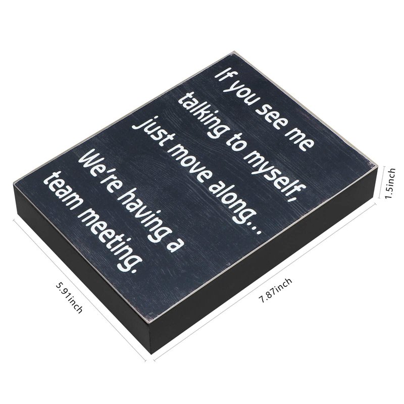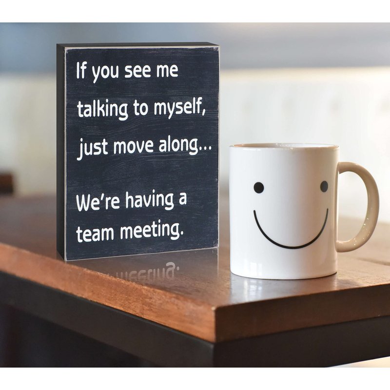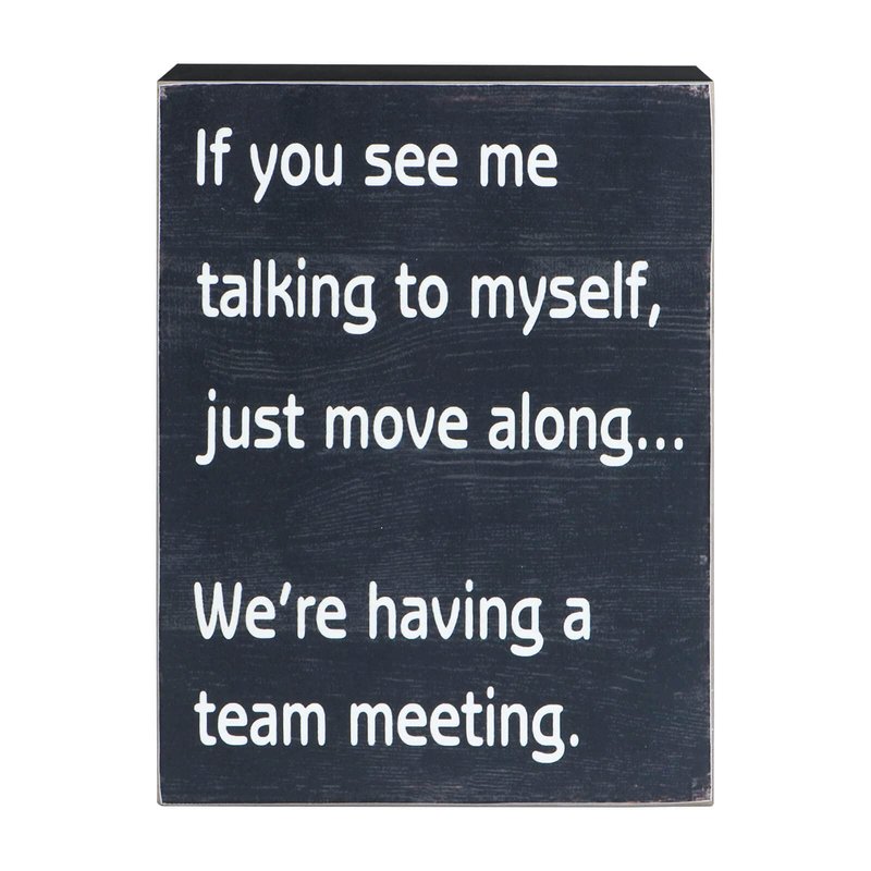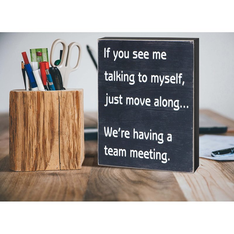 Perfect sign for desk - "if you see my talking to myself, just move along... we're having a team meeting". This fun saying will be sure to delight everyone who sees it. Adds some personality to your drab space and also let people know you may be in an actual meeting or a personal meeting. Everyone gets a chuckle!