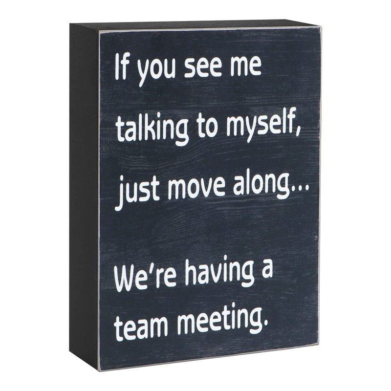 - Funny Cubicle Accessories - The sign quote says: if you see my talking to myself, just move along... we're having a team meeting. This fun saying will be sure to delight everyone who sees it