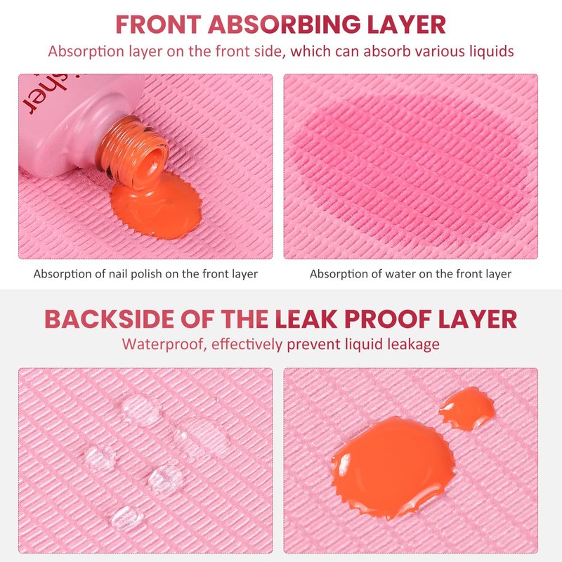 - 💗 Double-sided design: These disposable nail mats feature a double-sided 3 ply structure design, consisting of 2 layers of wood pulp paper and 1 layer of polyethylene film. The wood pulp layer is film absorbs water, and the PE film waterproof.