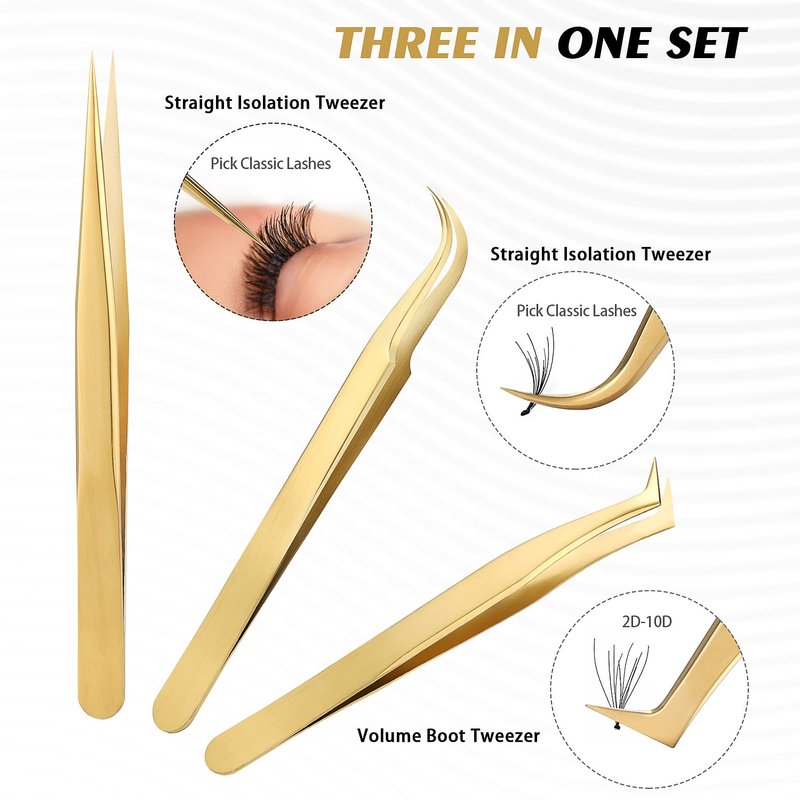 - 💗 Everything You Need for the Perfect Lash: Our three-in-one kit includes straight pointy tip isolating tweezer, 90-degree boot volume tweezer for 2D-10D fan making and curved tweezer for classic lash applications.