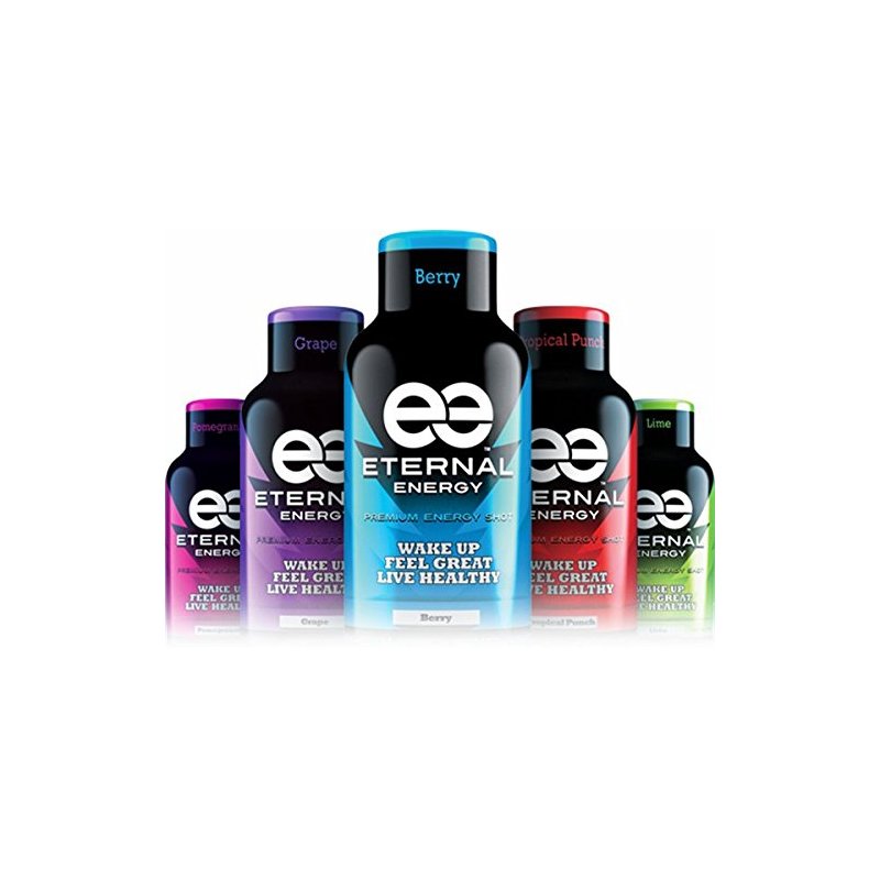 The healthy choice for lasting energy. With 25 vitamins, amino acids and antioxidents, the premium ingredients in Eternal Energy Shot are proven to provide you with balanced energy, increased athletic endurance and physical recovery. The most balanced and powerful energy shot on the market, Eternal Energy Shot's premium energy blend contains a balanced formulation of taurine, green tea extract, vitamin c, b-vitamins, l-theanine, and the breakthrough antioxidant quercetin. Eternal Energy Shot contains absolutely no sugar or calories with less symptoms of jitters or crash. The ingredients in Eternal Energy Shot have been scientifically proven to increase endurance up to 51%, increase speed, 66% increase in physical recovery speed, and increases in focus and concentration. Eternal Energy Shot is available in Berry, Pomegranate, Tropical Punch and Grape flavors.