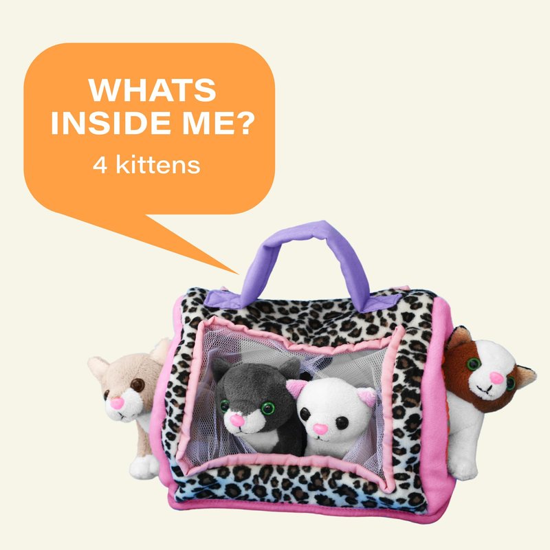 - PLUSH ANIMALS WITH CARRIER – Plush animals with carrier – This toy cat set is perfect for little cat and kitty lovers. Includes soft plush, leopard print carrier and 4 cute cats. Designed for babies aged 6 months +