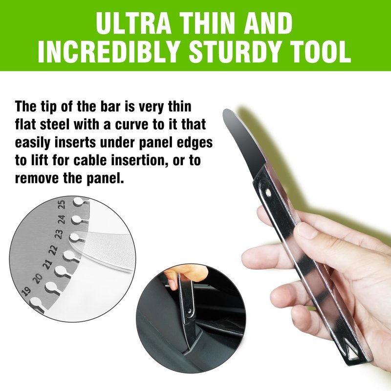 - Compact & Ultra Thin: The length of the trim panel removal tool is 7.1'' x 1'' size, The tip of the bar is very thin flat steel (23GA) with a curve to it that easily inserts under panel edges to lift for cable insertion, or to remove the panel.