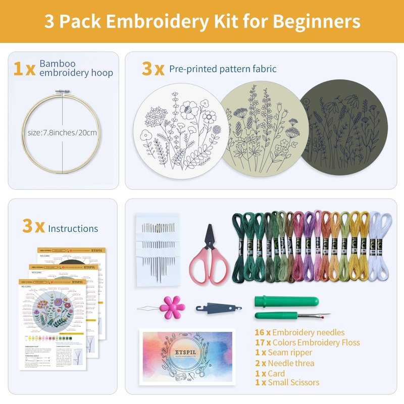 ETSPIL 3 Sets Embroidery kit for Beginners Adults,Learn 33 Different Stitches DIY Kits ,Includes Stamped Flower Pattern, Hoop, Color Threads,Tools,Easy to Follow Instruction & Video… (Flower A3)
