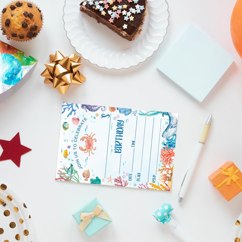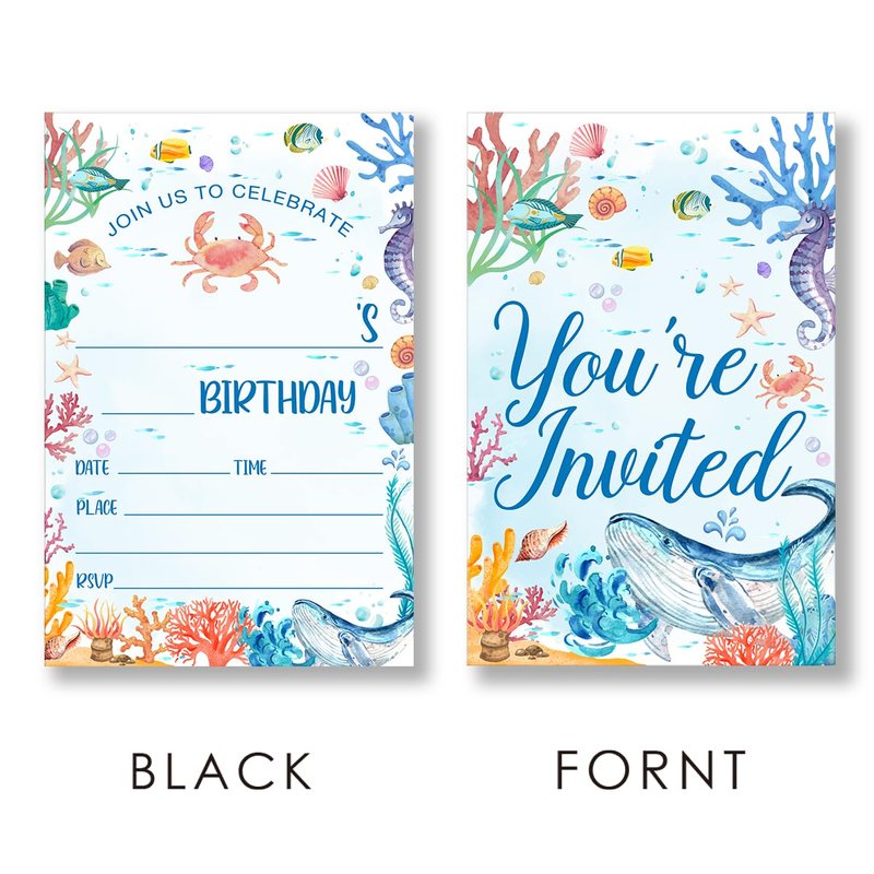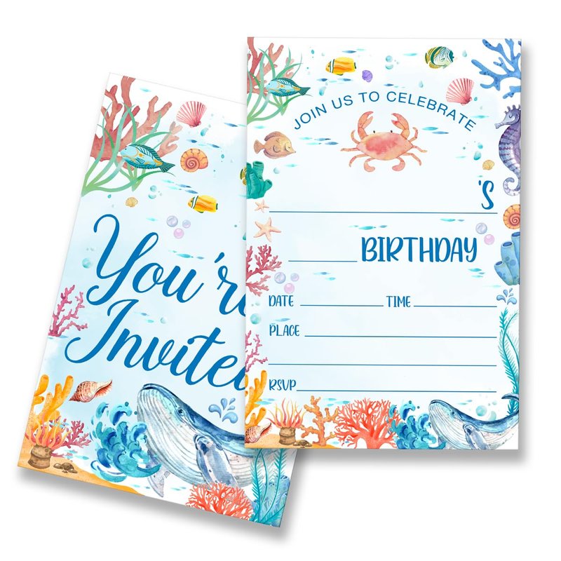 EUDOSI Under the Sea Birthday Party Invitations Supplies Fill-In Set of 20 with Envelopes Whale Crab Sea Life Birthday Party Invites Cards, Double Sided