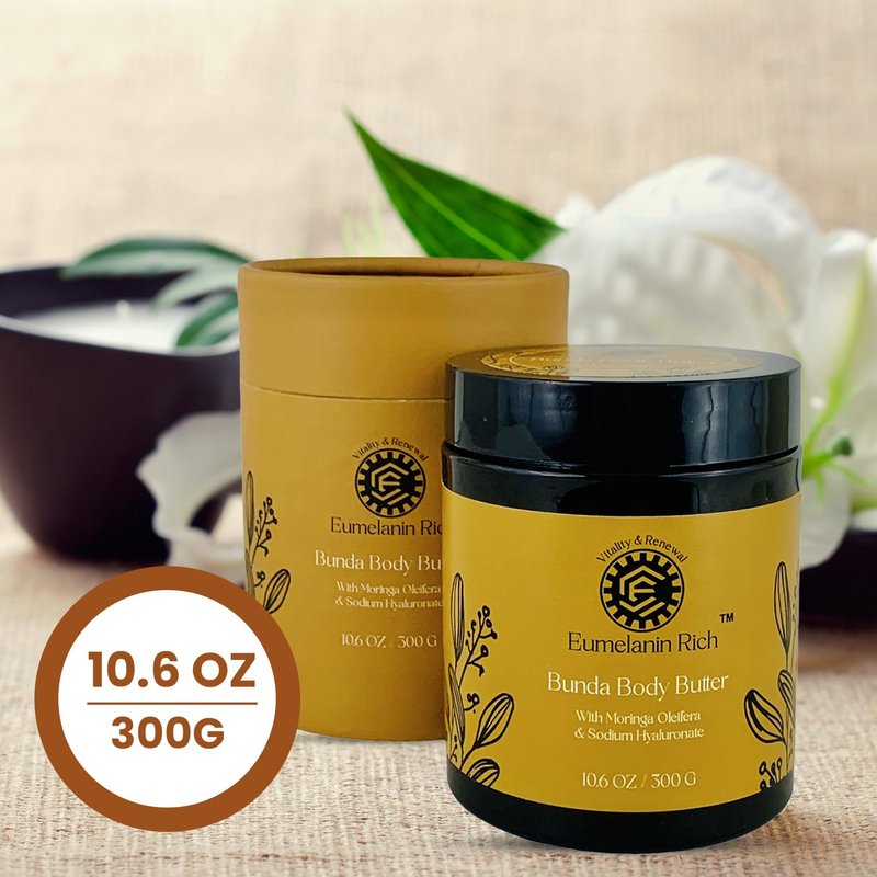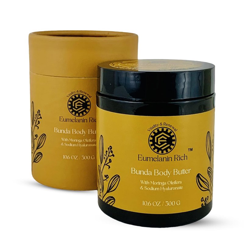 - VITALITY & RENEWAL-Eumelanin Rich Bunda Body Butter is your skin's best friend. It visibly smooths and softens, supports overall skin health and restoration. It encourages collagen production, improving skin's elasticity and firmness, helps to reduce the appaerance of stretch marks, revealing a more even skin tone. The result? Supple, plump, silky- smooth skin that defies fine lines, wrinkles and dullness - giving you a youthful, natural glow.