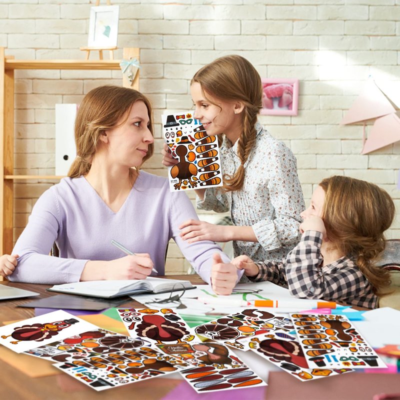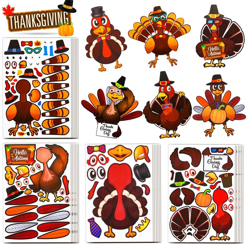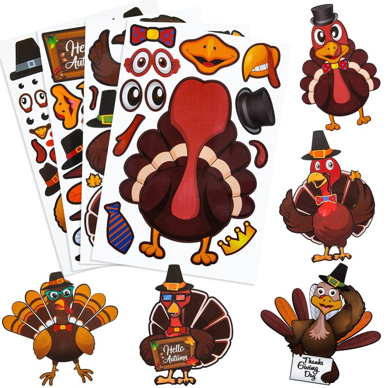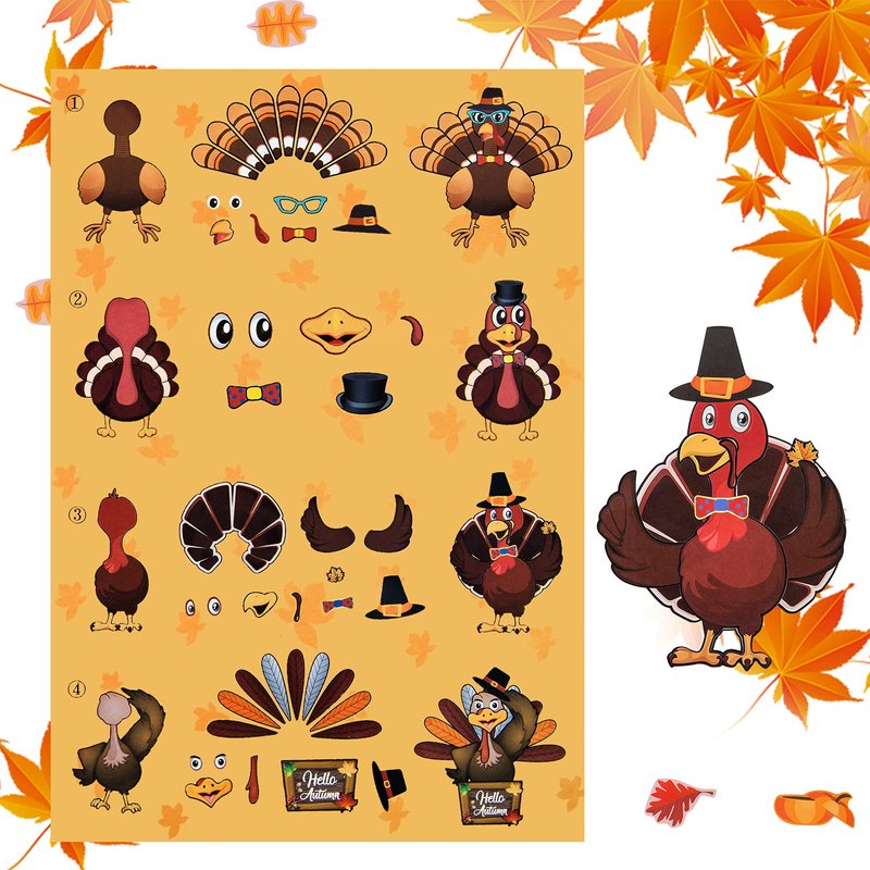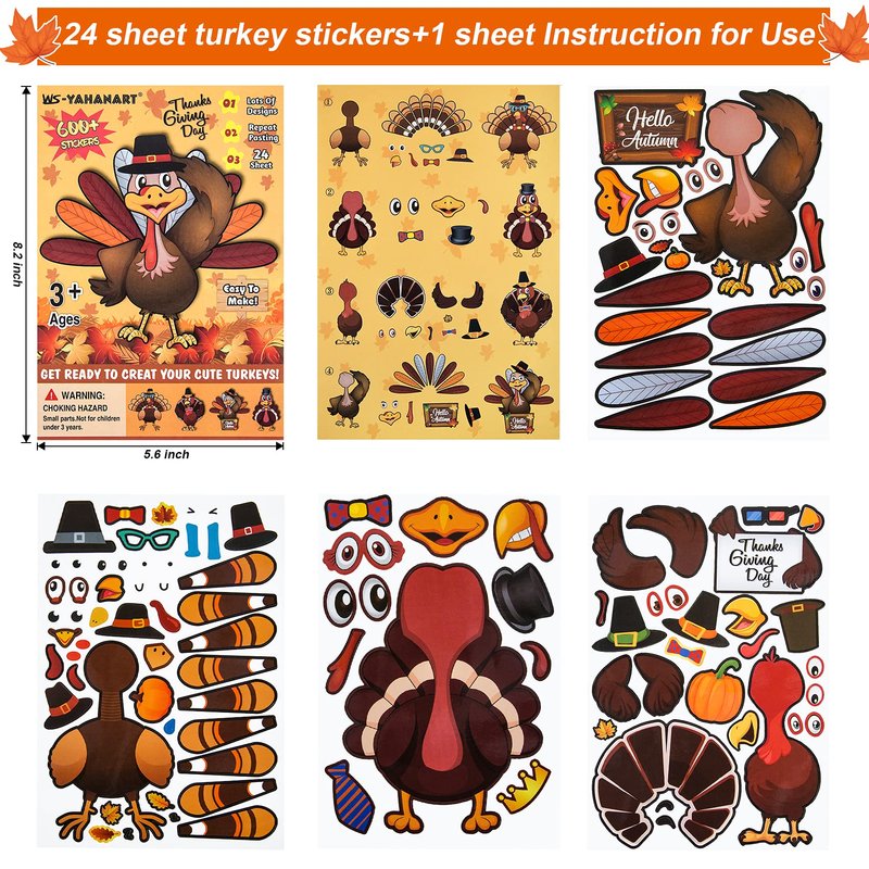 - Make-A-Turkey: Every package includes 24 sheets thanksgiving turkey stickers with 4 kind of designs, each sheet can make at least five styles cute turkey