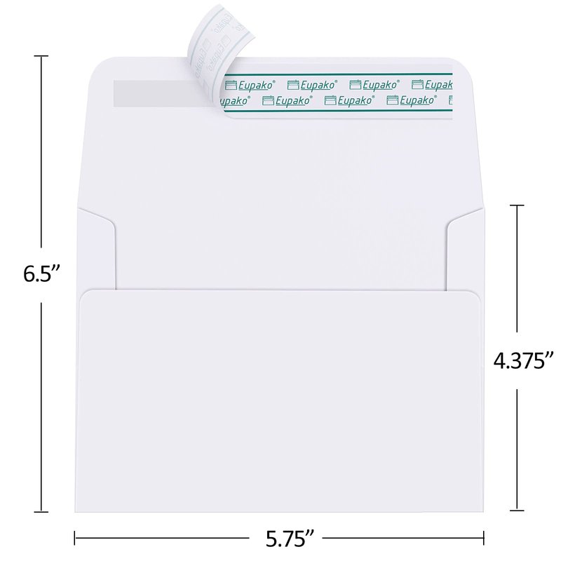 - Self-sealing Flap: The white envelopes is easy to use. Just peeling off the strip and sealing the flap to get an effortless mailing, no need to lick or moisten. Also, the adhesion of flap on envelopes a2 is quite strong, secure and lasting, keeping contents from falling out when transiting.