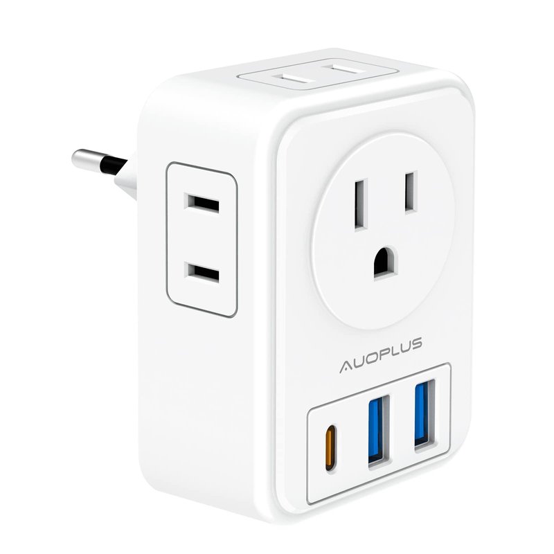 European Travel Plug Adapter, AUOPLUS International Power Plug Adapter with 3 USB Ports (1 USB C), 4 AC Outlets Cruise Ship Essentials for US to Most of Europe Spain Italy France Germany