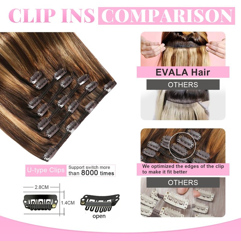 - 【Clip in Hair Extensions Real Human Hair 】- Evala clip in hair extensions are made of real human hair. No shedding when the finger combing the clip in hair extensions. Extremely soft and smooth, just as good as your own hair.