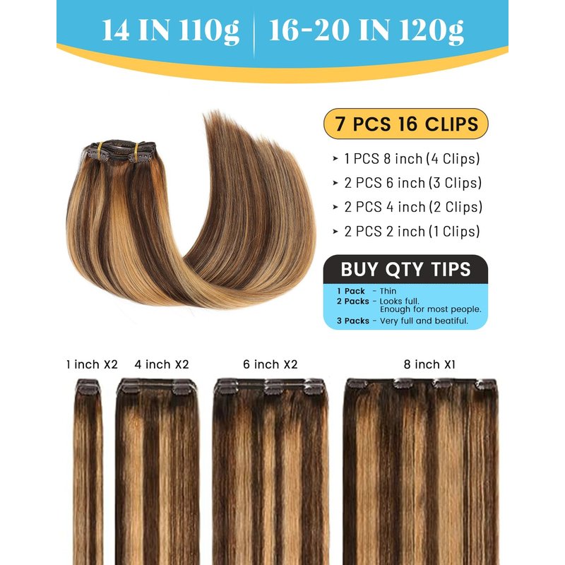 - ðãQuantityã Evala clip in hair extensions is 110-120g. Each pack of 14" clip ins hair extensions human hair is 110g, others is 120g. We recommend purchasing 1-2 pack to achieve a perfect result.