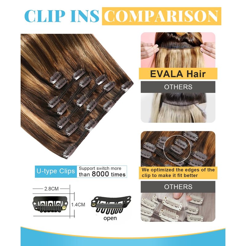 - ðãClip in hair extensionsã Evala hair extensions real human hair clip ins is double weft. We have optimized the splicing details of the clip and paid more attention to the customer's feelings. They can be restyled, strengthened, curled and dyed.