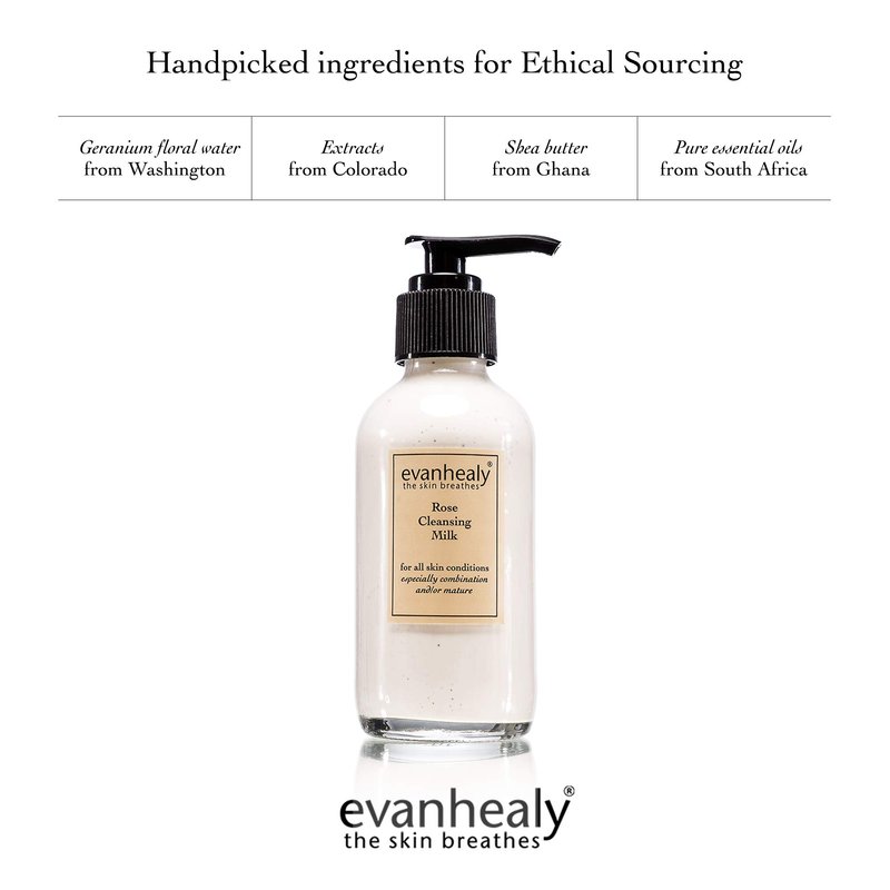 evanhealy Rose Cleansing Milk pairs the creaminess of plant-milk with the lightly lathering action of natural yucca root creating a nourishing, effective, and deep cleansing product. This skin-balancing formula effectively draws impurities out of tiny dermal pores leaving skin exquisitely clean. Daily use softens and loosens the hardened waxy deposits that are blackheads. Adding plant oils and floral waters to the skin restores vitality, balances hydration and refines pores resulting in skin that is soft, supple and resilient. The holistic and organic skin care products by evanhealy are inspired by the wisdom of nature, formulated to support the rhythms of the body, and created to transform the modern perception of beauty. evanhealy works with family farms, tribal villages, and self-governed women’s cooperatives and they utilize many sustainable practices including eco-friendly packaging. Free of GMOs, synthetic ingredients, fragrances, petroleum-based products, parabens, and gluten. Certified Organic ingredients. Cruelty-free and Vegan.