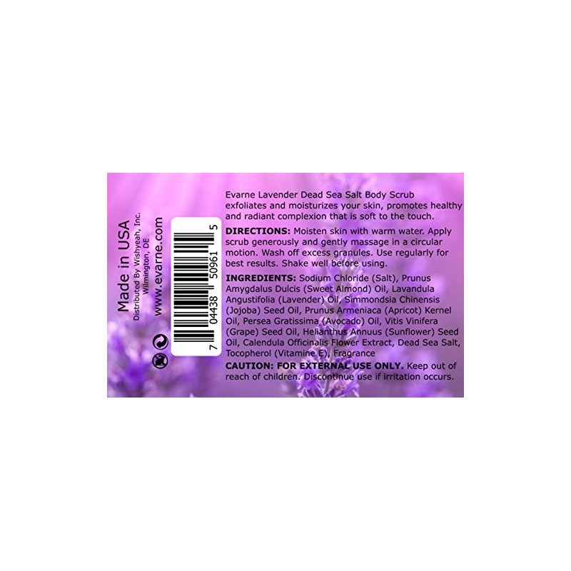 Lavender Dead Sea Salt Body Scrub is infused with 7 oils - Sweet Almond oil, Lavender Essential oil, Jojoba Seed oil, Apricot Kernel oil, Avocado oil, Grape Seed oil, Sunflower oil, Calendula extract, and Vitamin E. Natural exfoliant and nourishing moisturizer, refreshing and engergizing.