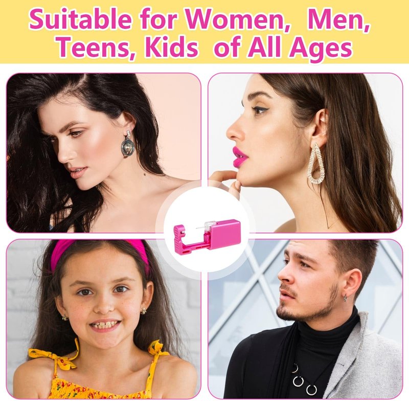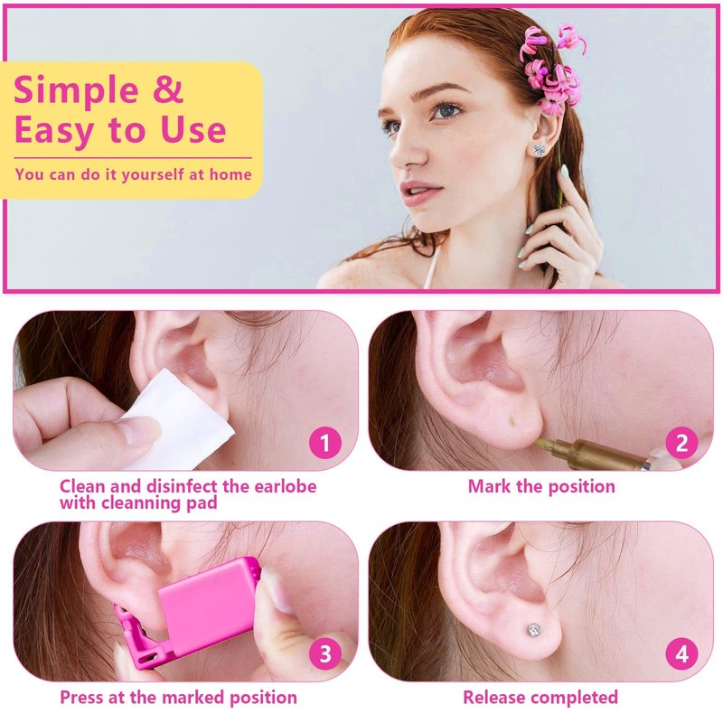 - 【Easy to Use】The earring piercing kit is designed with a rose pink shell in small size, which fits comfortably in your hand and reduces fear to a certain extent, fast and firmly press down the piercing gun, and it will easily locate where you want the hole to be exactly. Meanwhile, the main body of the tool will fall off automatically after the ear nail passes through the earlobe, providing you with a quick, and low-pain piercing process.