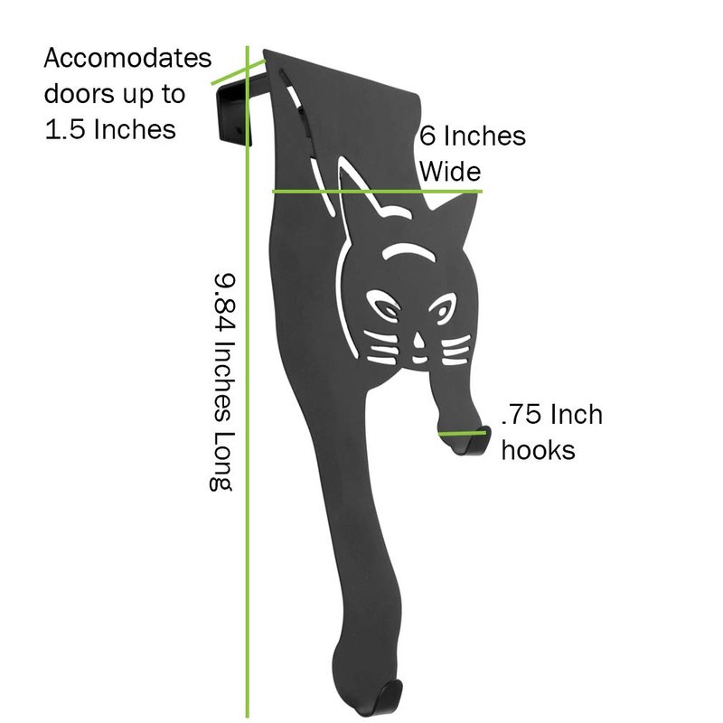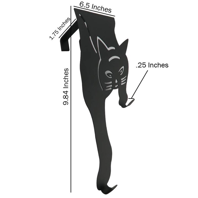 Cast aside your superstitions! Instead of crossing your path, this black cat extends his paws over your door to provide two extra hooks for hanging clothes, coats, accessories and other items. Conveniently increase storage space and reduce clutter with this easy-to-install over-the-door mount. No tools required. Perfect for placing over your bathroom or bedroom door to hang bathrobes and towels, or hang inside a closet or office door to organize jackets or hats. A great gift for any cat lover! Features cute cat silhouette with details including eyes, whiskers, nose, mouth, and ears to define cat's facial features. DETAILS: Holds up to 20 pounds. Fits door measuring up to 1.75 Inches Wide. Overall measurements are approximately 9.84 Inches High x 6 Inches Long x 1.75 Inches Wide. Constructed of sturdy, long-lasting iron that is encased with a rust-free black coating.