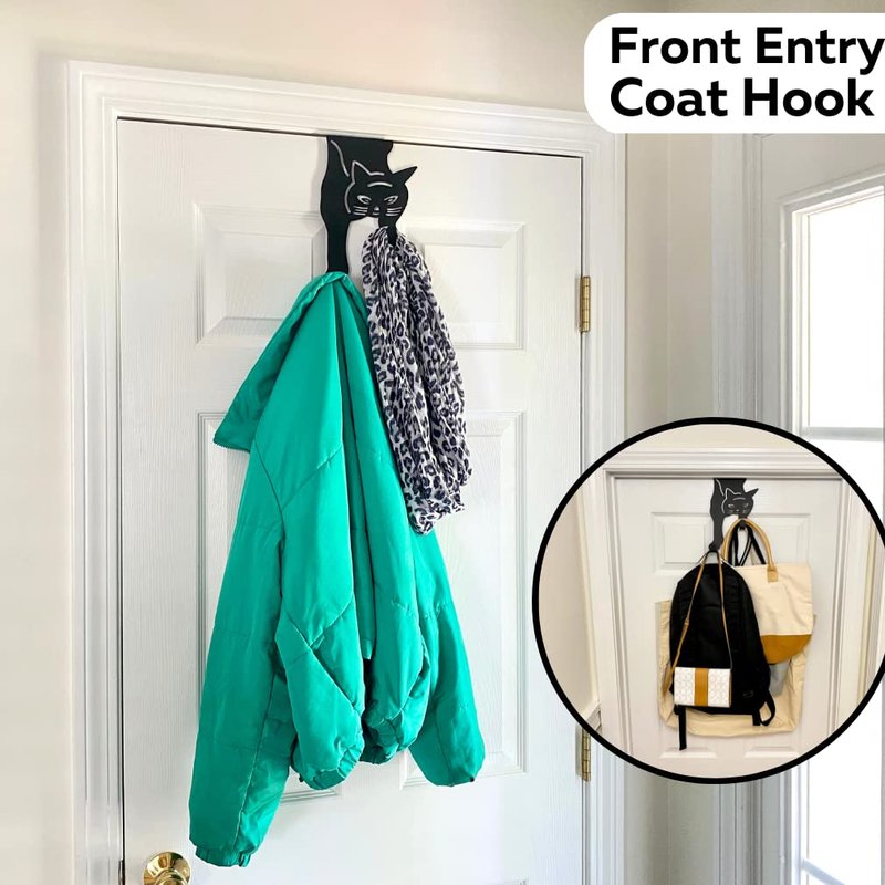 - Over the Door Hanger : Evelots black cat extends his body over your door to provide 2 strong "paw-fect" hooks for hanging your clothes, accessories, jackets, or purses. Perfect door hanger for a hat, coats, bags, keys , kitchen towels or use for an over the door towel racks for the bathroom