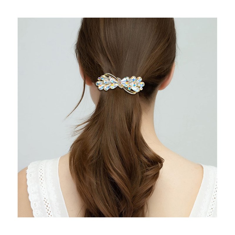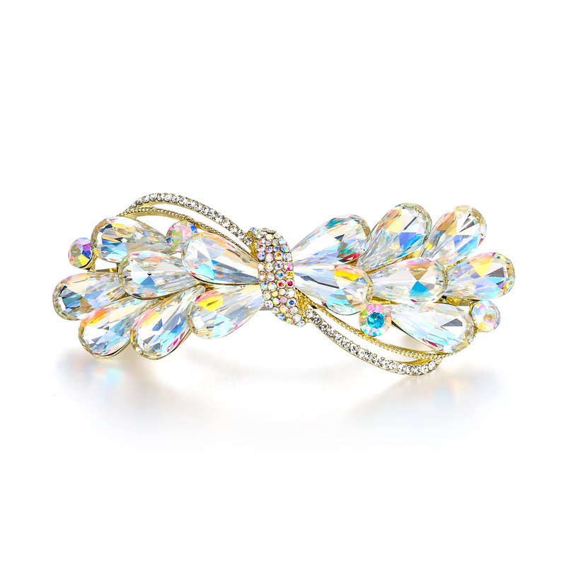 EVER FAITH Wedding Austrian Crystal Hair Barrette Clip, Rhinestone Waterdrop Bowknot Hair Accessories for Women Iridescent Clear AB Gold-Tone