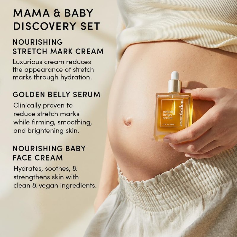 - FIRMS, BRIGHTENS, & SMOOTHS: Apply the luxurious pregnancy stretch mark cream, and follow with Golden Belly Serum in the new mom self care kit to firm, deeply hydrate, and nourish skin.