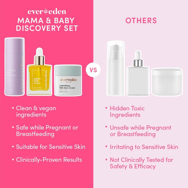Evereden Mama & Baby Discovery Set - Dermatologist-Developed Clean & Vegan Maternity Skin Care Bundle - Stretch Mark Cream, Belly Serum, & Nourishing Baby Face Cream - Postpartum Gifts for New Mom
