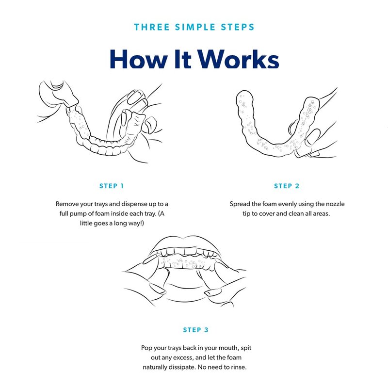 - EASY TO USE: No brushing, rinsing, or soaking required, our aligner cleaner foam is quick and easy to use. Simply apply one pump directly onto the tray and use the nozzle tip to spread the foam evenly across. This clear aligner foam is suitable for all-day wear and safe for sensitive teeth.