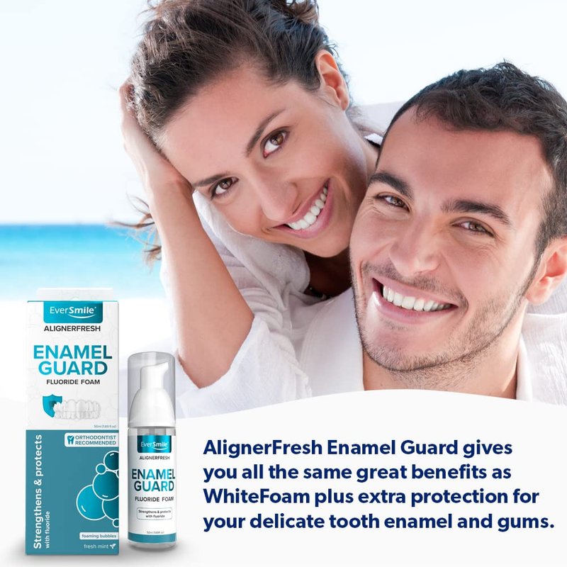 - FLUORIDE FOAM TREATMENT: Enamel Guard offers the same benefits as AlignerFresh Original Clean plus added protection for your tooth enamel and gums. The fluoride formula adds a layer of defense against harmful bacteria that can cause tooth decay and cavities. It also helps remove plaque and prevents gingivitis.