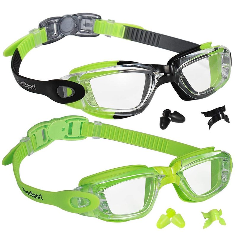 EverSport Kids Portable Swim Goggles, Pack of 2 Swimming Goggles for Children Teens, Anti-Fog Anti-UV Youth Swim Glasses Leak Proof for Age4-16, Green/Black & Green