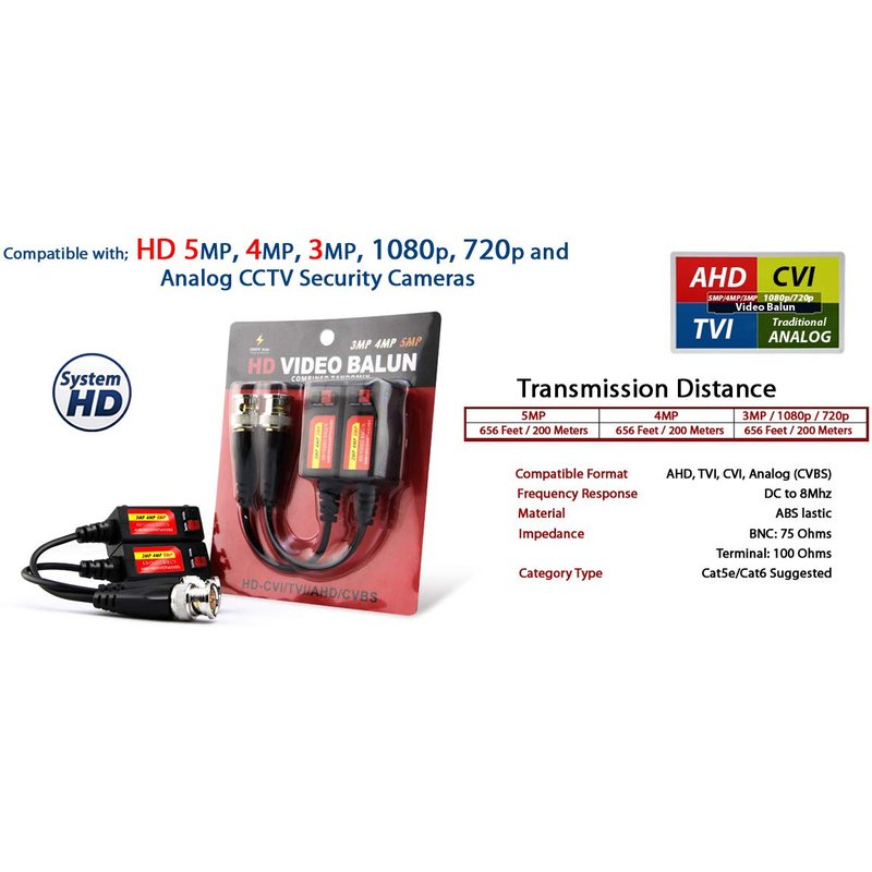 - Compatible with all 5MP / 4MP / 3MP / 1080p / 720p HD-CVI, HD-TVI, HD-AHD, NTSC, PAL and SECAM video formats. 60 Db cross talk and noise immunity. Spring type connection terminal channel passive HD transceiver, male BNC allows connection directly to TVI/CVI/AHD or camera system,gold plated BNC better transmission quality long distance HD transmitter. No power required !
