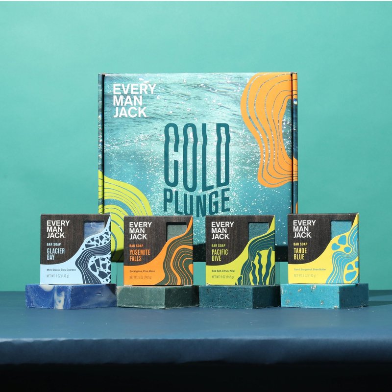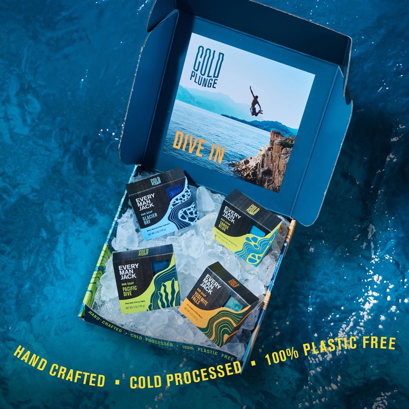 Every Man Jack Cold Plunge Mens Bar Soap Set - Deeply Cleans, Hydrates with Naturally Derived Ingredients - Iconic Cold Water Scents - Pacific Dive, Glacier Bay, Tahoe Blue, Yosemite Falls, 4 Bar Set