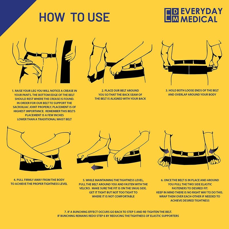 - SI BELT - SACROILIAC JOINT HIP SUPPORT SIZE SMALL / MEDIUM fits a Hip Circumference of 30-44 IN. Must Measure around your Hips which are around 2-3 inches lower than your waist *Refer to the Size Chart in the images section Our Best Selling SI JOINT BELT by Everyday Medical is a hip support solution for men and women. Designed to reduce and relieve strains and pains associated with your Pelvis, SI Joints and Sacroiliac Joints by stabilizing and creating compression around your hips.