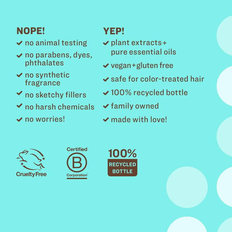 - Free of artificial fragrances, SLES/sulfates, silicones, phthalates, parabens, gluten.