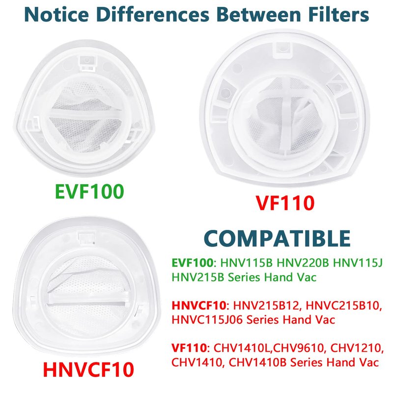 - PLEASE NOTE: There are THREE different models of hand vacuum filter and equipped with different vacuums --- Cordless Hand Vacuum models HNV...CHV... and HNVC... series. PAY ATTENTION: This EVF100 Filter is NOT compatible with HNVC... series and CHV... series models! (For more details please read picture 3 carefully) To make sure what you purchased evf100 filters are the parts you needed please check your vacuum models twice, and hope you have a pleasant shopping in our store