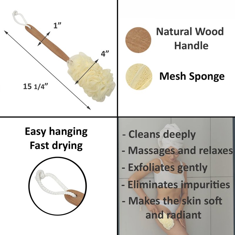 - NATURAL MATERIALS: Made with natural wood handle, this mesh bath sponge will give you a relaxing cleansing. Dimensions: 15 1/4”L x 4”W x 3"H. Color: natural
